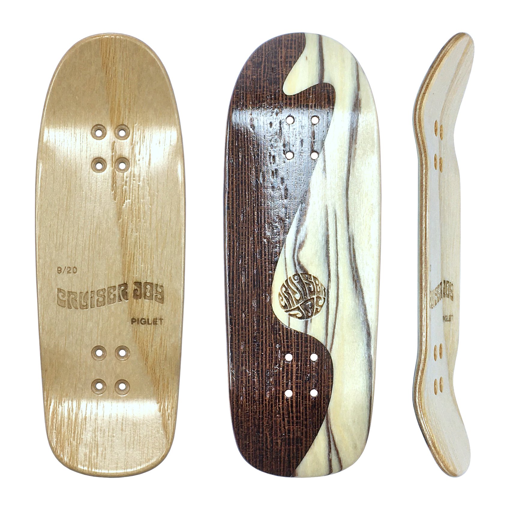 Piglet shape with laser engraved bottom logo above rear trucks as well as top logo. Glossy clearcoat finish.